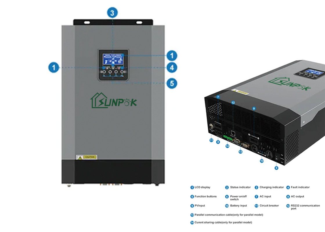 Omschakelaar met hoge frekwentie van het Sunpok5kw is de eenfasige van-net geschikt voor gebieden zonder macht, nomadische gebieden, communicatie basisstations, gebieden met onstabiele macht, eilanden, grensposten, toneeldiebeheersbureaus, kiosken, batterijpakken voor batterijfabrikanten, enz. met LEIDENE vertoning worden uitgerust, steunen USB/RS232/RS485/Bluetooth/Dry-Contact, compact ontwerp, en high-cost prestaties.